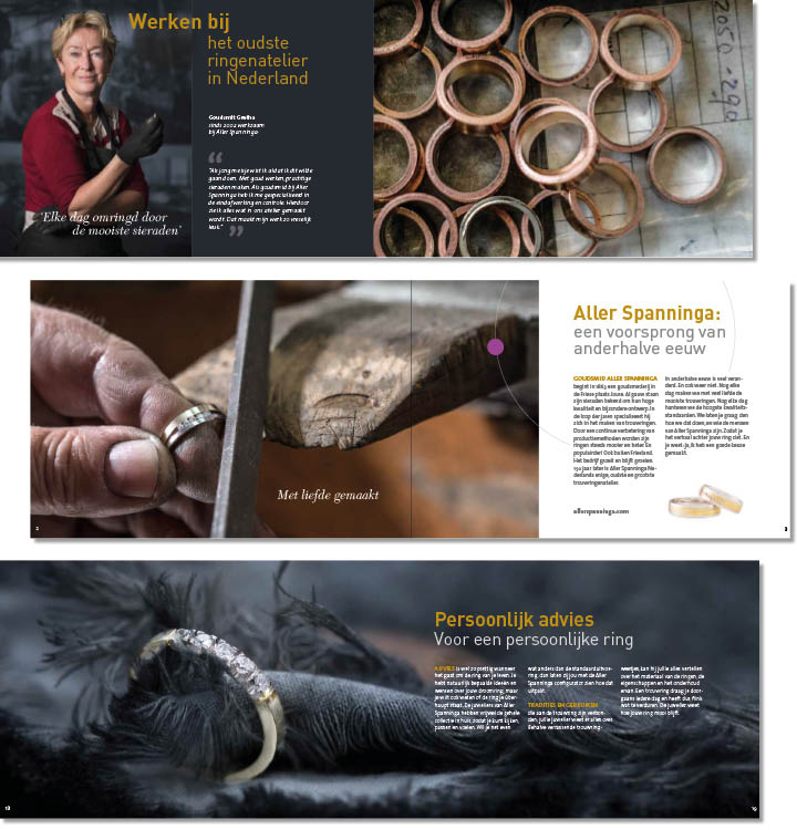 De eerste opdracht die ik voor het oudste ringenatelier van Nederland maakte was deze brochure, die de sfeer van ‘vakmanschap is meesterschap’ uitstraalde. Niet lang daarna volgde het tijdschrift ‘YES’ dat meer de vies van een lifestyle magazine heeft en bij de juweliers op de koffietafel ligt.