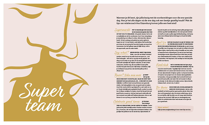 In navolging van de brochure is er nu ook een magazine van Aller Spanninga dat op de koffietafels bij de juweliers ligt. Een eigentijds magazine over trouwen en trouwringen met prachtige foto’s van Maaike van Esch.
