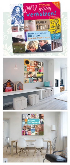 Het begon met een verhuiskaart voor ons eigen gezin. Die had ik zelf ontworpen en hij was leuk. Ik vergrootte mijn ontwerp tot 'muurformaat’, liet het op canvas printen en hing het doek op in de woonkamer. Ik kreeg meteen reacties. Mensen vroegen of ik zo’n 'ontwerp op maat’ niet ook voor hen kon maken. Het bleek een uitstekend kado, persoonlijk en origineel. Ook leuk om met meerdere mensen te geven.