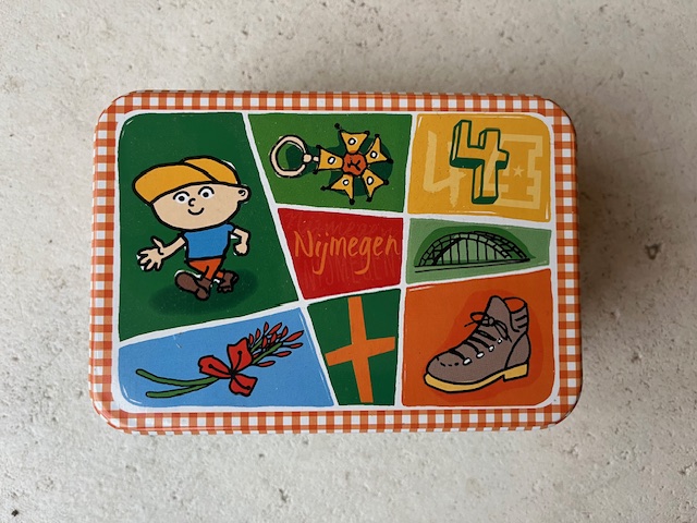 Allereerst zag het blauwe blik met typisch Nijmeegse ikoontjes het licht. Al snel volgde het tweede, groen-oranje Vierdaagse blik.